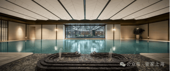 恒温泳池:第一,采用了景德镇烧制的陶瓷马赛克,独特的釉面色彩由 景德镇老师傅手工浇筑而成,充满人文艺术底蕴;第二,羽毛天花造型,由 600余件铝板打造,表面采用了仿贝壳纹的艺术漆处理,带来松弛度假感;第三,不仅配置了约25m×10m的4道泳池,还采用了 奥运会同款空调除湿系统,彰显高档品质细节!