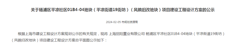 2023年11月,杨浦区平凉社区01B4-04地块(平凉街道19街坊)实施主体遴选结果公示,为招商&海门国资委。