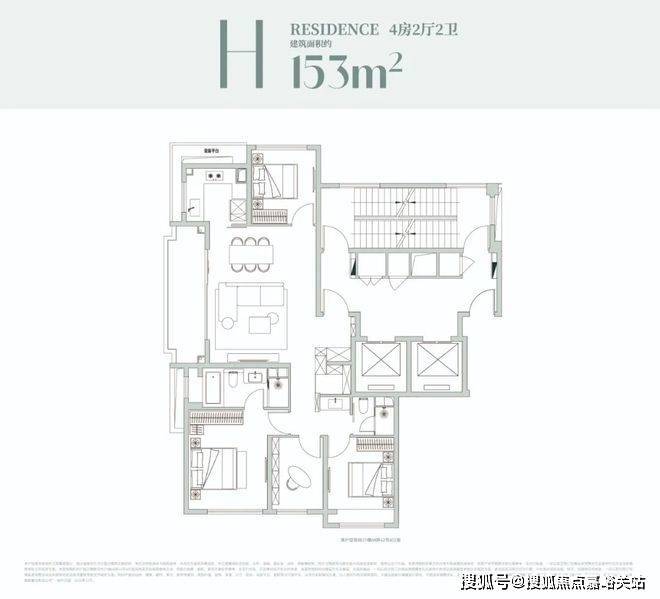 该户型是经典的四叶草布局,四开间分布在四角,兼顾私密与互动,是二胎家庭的优选;