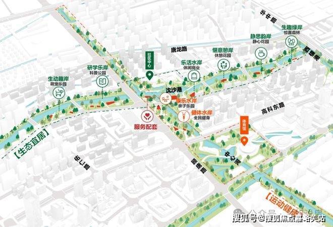 项目近距离内被唐镇公园、唐丰公园、华夏公园、张江科学城中央公园、4大公园环绕,这些都是城市稀缺的大型城市绿肺,天然氧吧,在为居民提供休闲,亲近自然的好去处的同时提供高浓度的负氧离子,净化空气。未来金城片区还将依托沈沙港、中心河打造特色蓝绿空间“十字绿轴”,构建连续滨水慢行网络和社区中心,集中营造多主题、多层次的主题岸线,形成丰富多样、有活力的水岸空间。