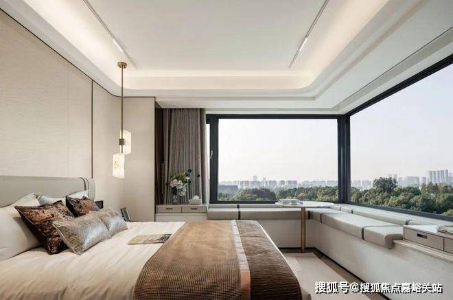 卧室同样颇具惊喜:边套户型配备约270°转角飘窗,推窗而见皆是景色;主卧不仅自带独立卫浴,还预留衣帽空间,能够同时满足男女主人的双衣柜需求,心爱的西装、手袋、礼裙都有了专属的陈列场。
