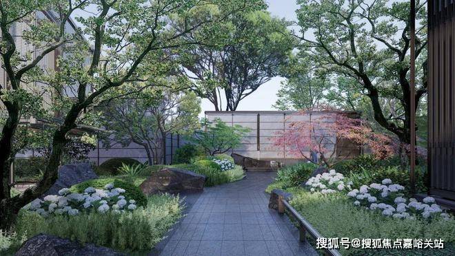 一条清韵石径,挑选造型独特的石头、三两组合成景,搭配特选的造型植物,极具艺术美感。而清泉石流景墙背后,就是未来业主的生活区。