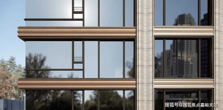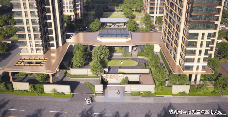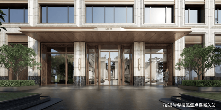 基座部分的单元入户选用石材、铝板等高品质材料,古铜色金属与通透玻璃搭配,结合专属定制单元门及中式挑檐,只为业主归家的一抹温暖质感。