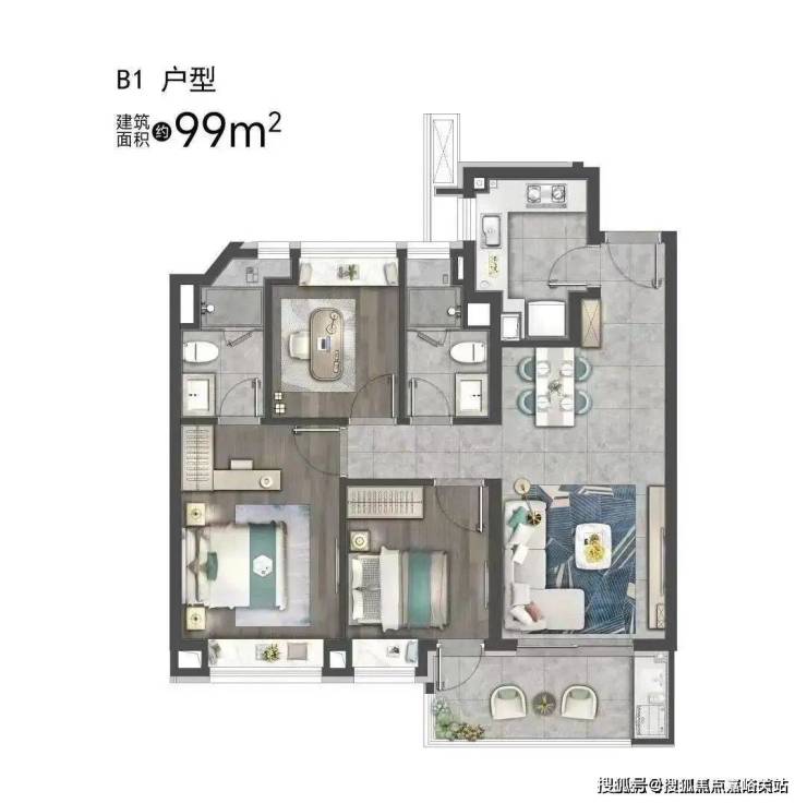 99平的三房两厅两卫,客餐厅连接景观阳台,采光面积更大,为日常生活带来更多的舒适感,并且多了一个卫生间为我们日后带来更为便利的生活。