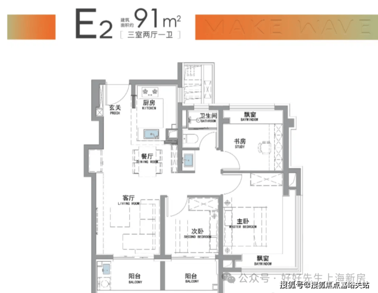 而招商·时代潮派|东屿此次建面约91㎡户型,就做出来了比市面百平户型更好的的“南向双阳台+南北双飘窗”设计。
