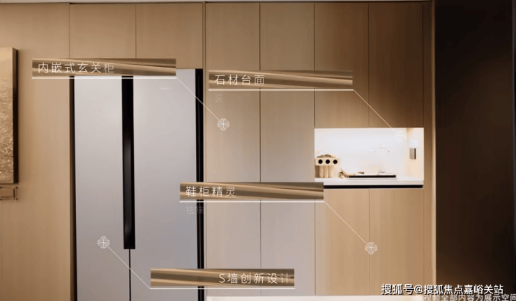 入户后,第一眼就可以看到玄关柜采用石材台面,下至标配鞋柜精灵,在S墙创新设计后,首批次房源更是额外赠送西门子双开门冰箱,这在以往可是上海千万级新房的交付标准: